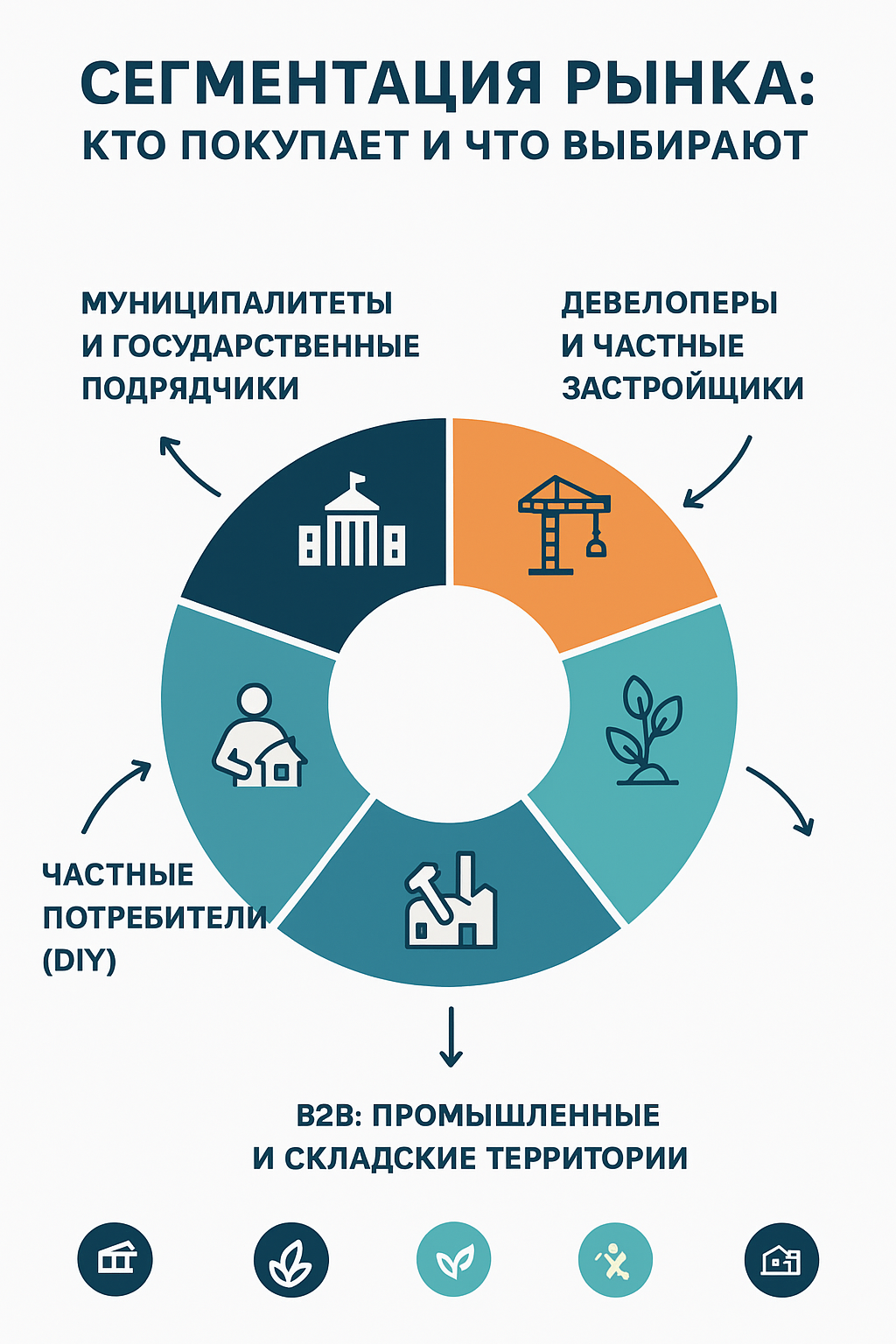 Растущий сегмент: садовые дорожки, террасы, подъезды. Для них важна простота укладки, упаковка небольшими партиями и доступность в рознице/mаркетплейсах.